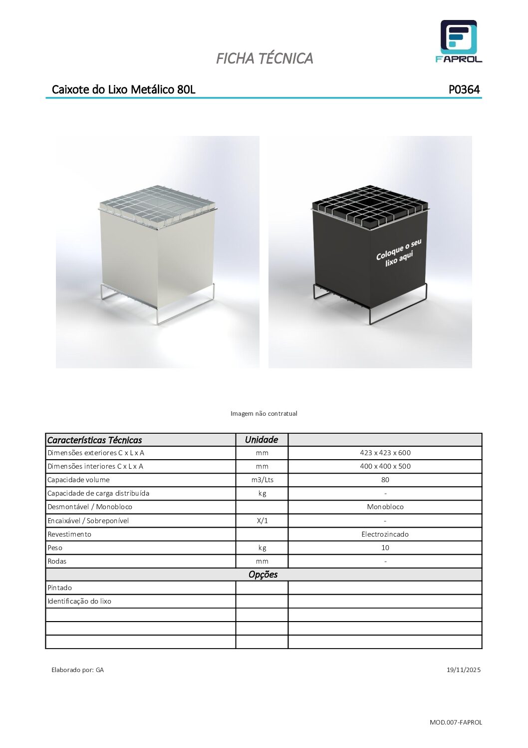 Está disponível com opção de pintura e identificação do tipo de lixo, permitindo personalização de acordo com o sistema de reciclagem ou codificação visual do cliente. Esta flexibilidade facilita a separação seletiva e a organização dos resíduos no local de trabalho.