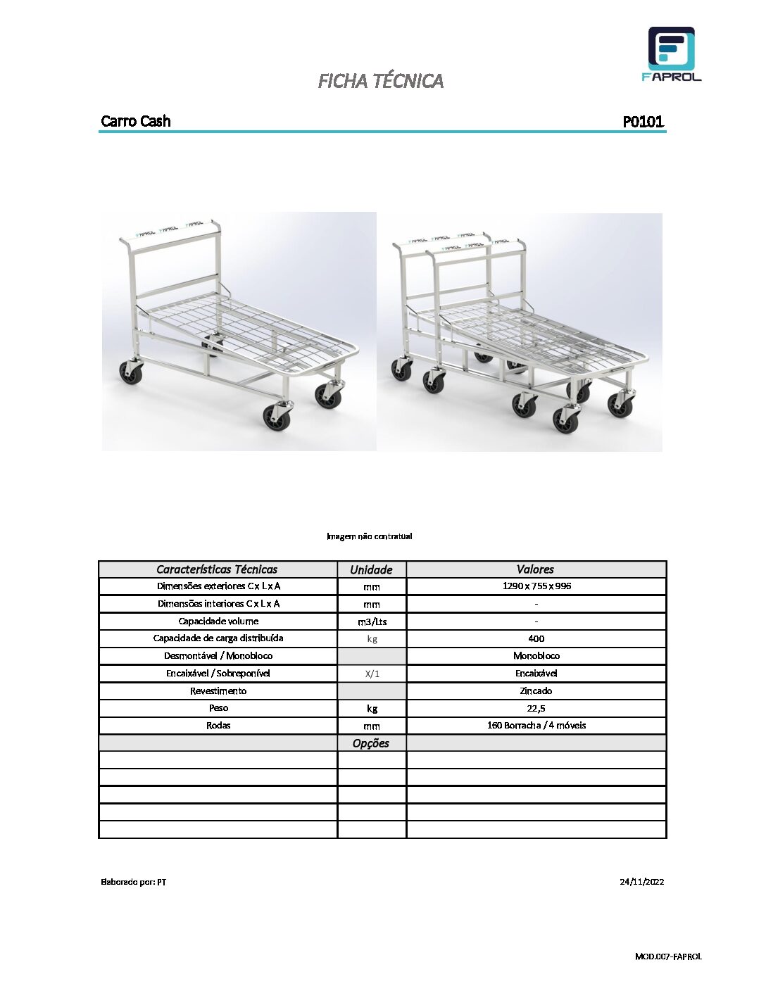 Carro Cash para transporte de material com plataforma encaixável ideal para Cash&Carry, lojas de bricolagem e armazéns. Possibilidade de ser equipado com cesto, moedeiro e pintado. Pedir Orçamento: