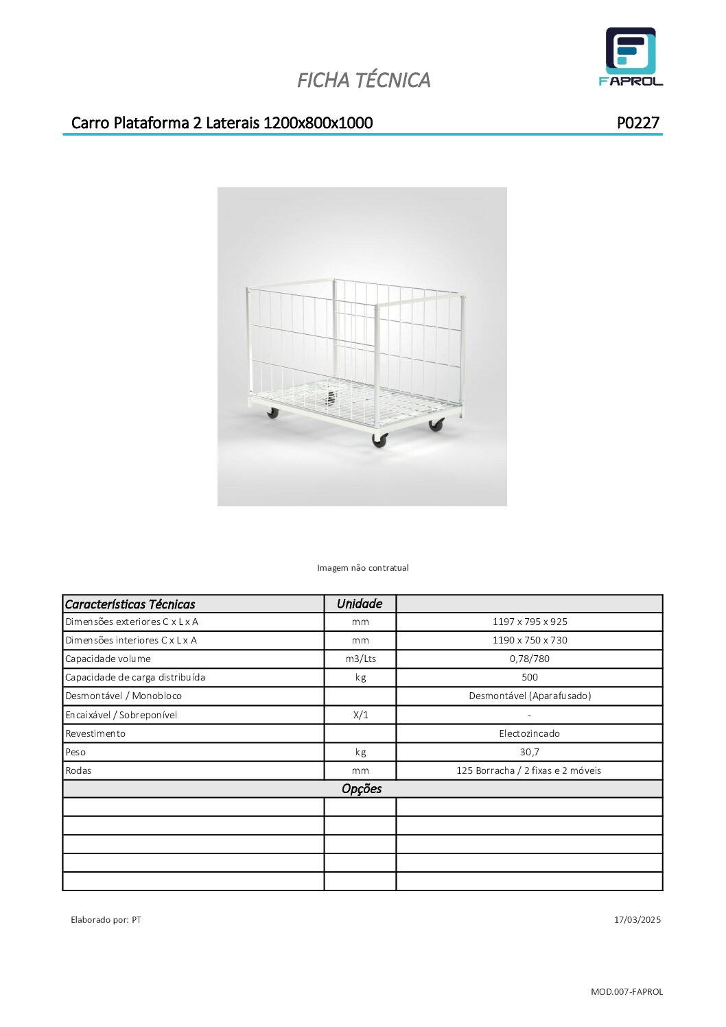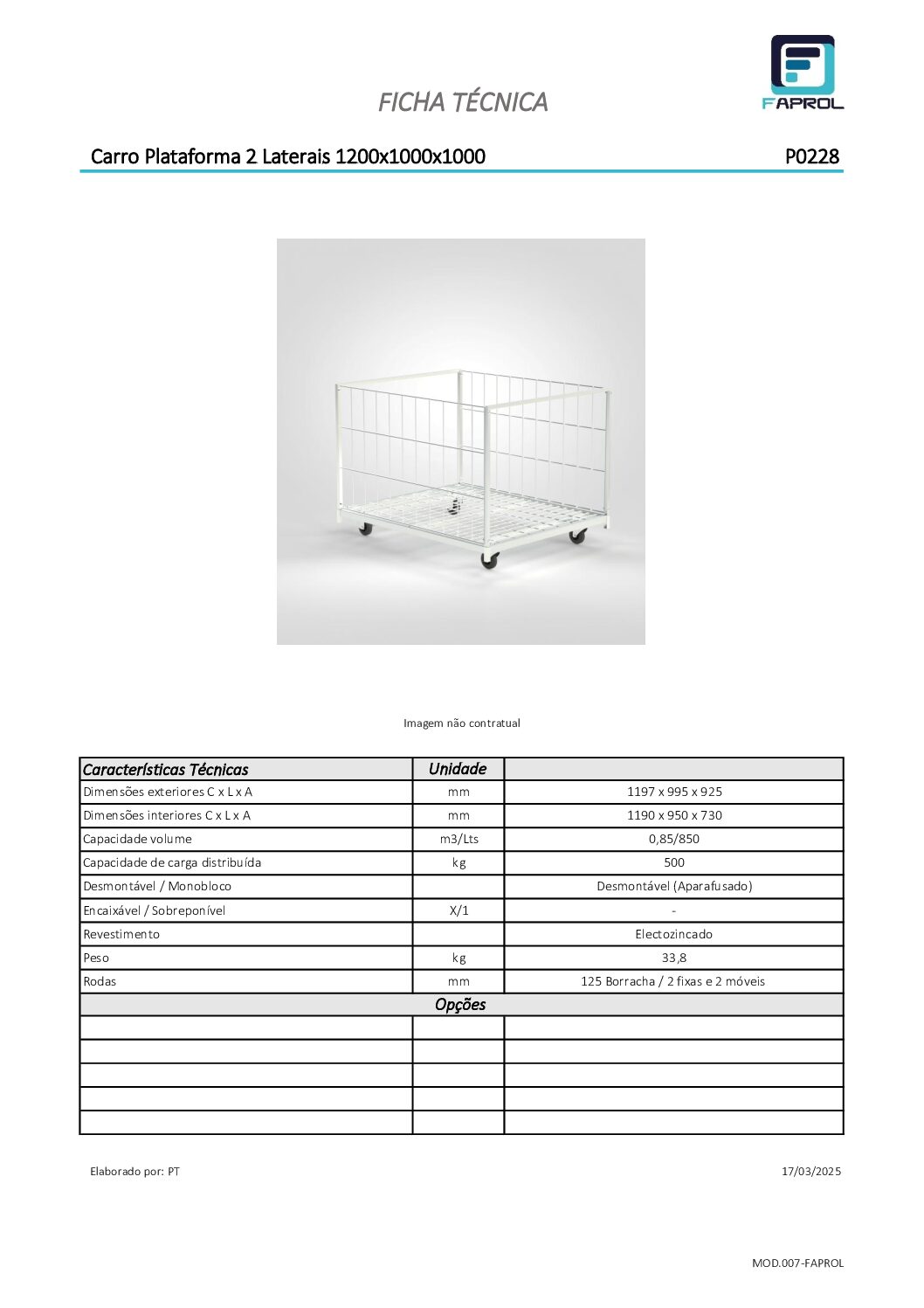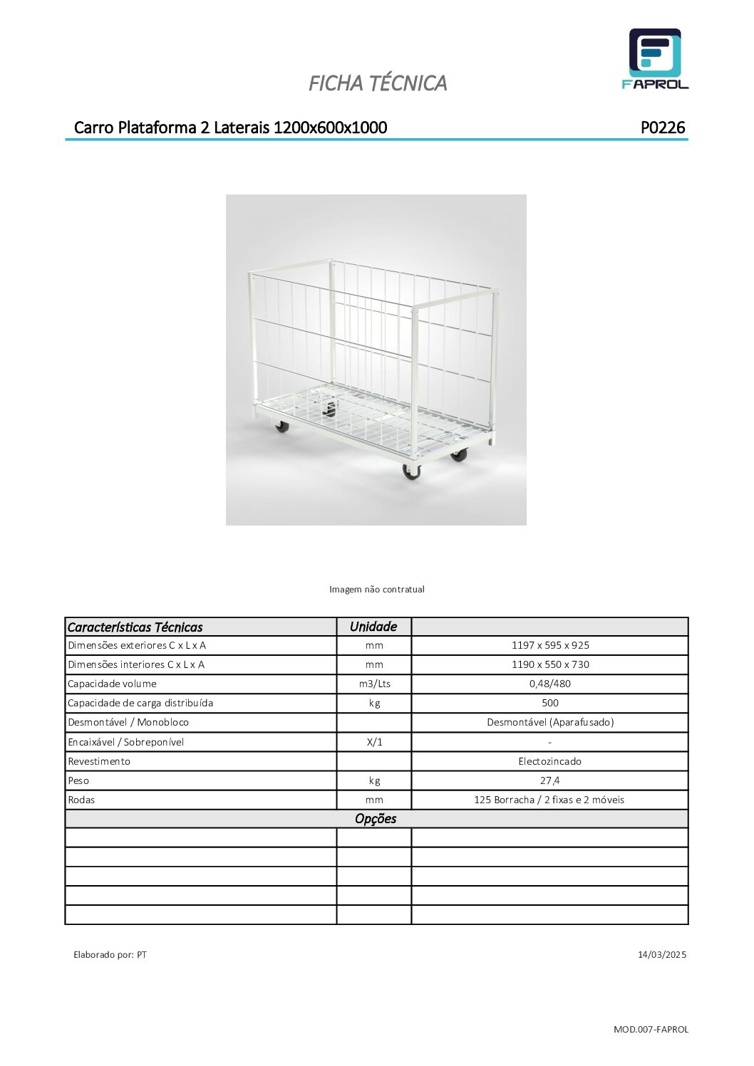 Carro Plataforma 2 Laterais 1200×600/800/1000mm proporciona mobilidade eficiente para transporte de itens em áreas comerciais e industriais. Estes carros Plataforma 2 Laterais 1200×600/800/1000mm são destinados a transportar grandes volumes. Capacidade de carga de 500Kg, acabamento electrozincado.