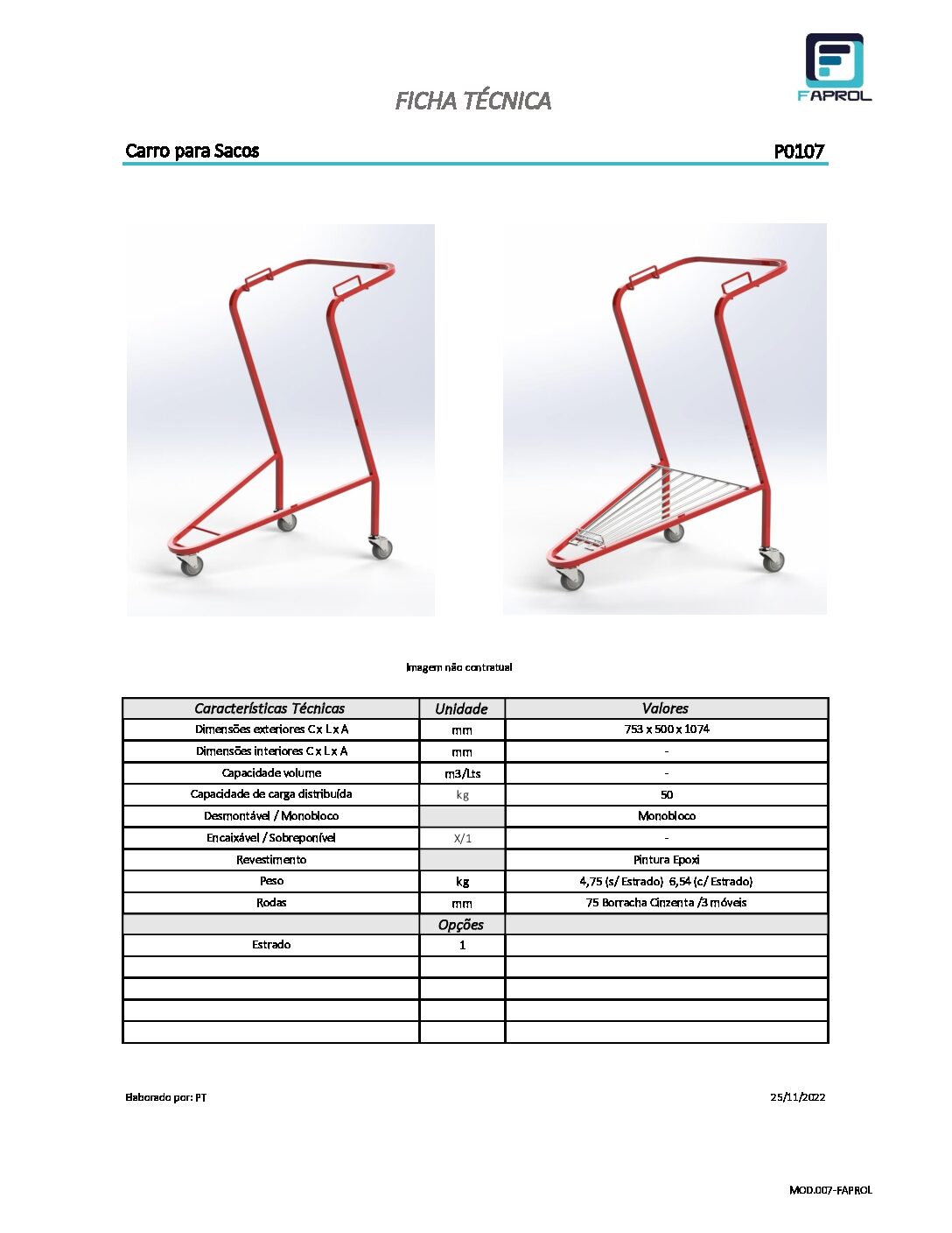 Com capacidade de carga até 50 kg, o Carro para Sacos pode ainda ser equipado com estrado opcional, adaptando-se a diferentes necessidades de utilização.