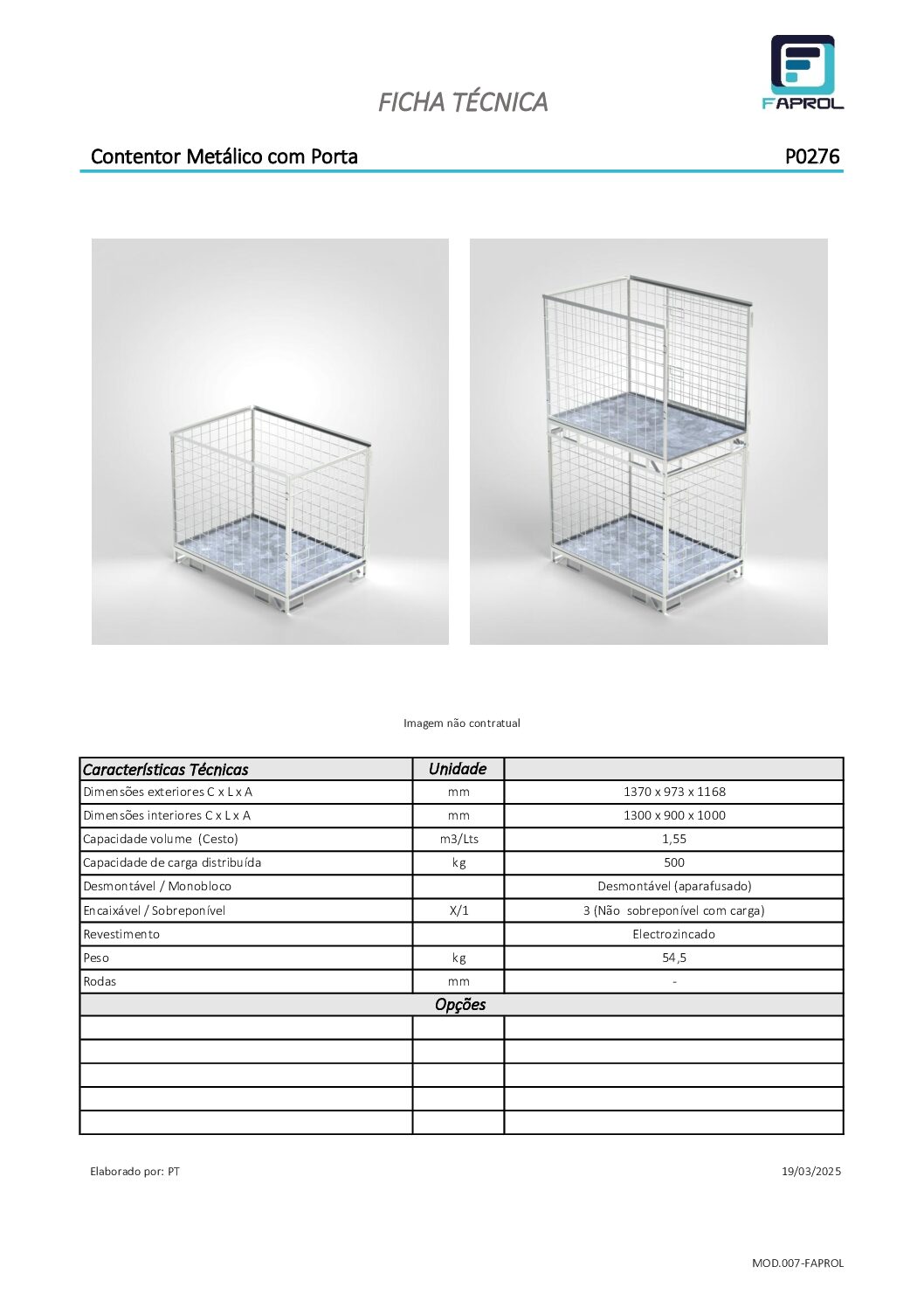 Fabricado em estrutura metálica robusta, este modelo inclui guias integradas para empilhador, garantindo manuseamento rápido, seguro e estável durante as operações de carga e descarga.