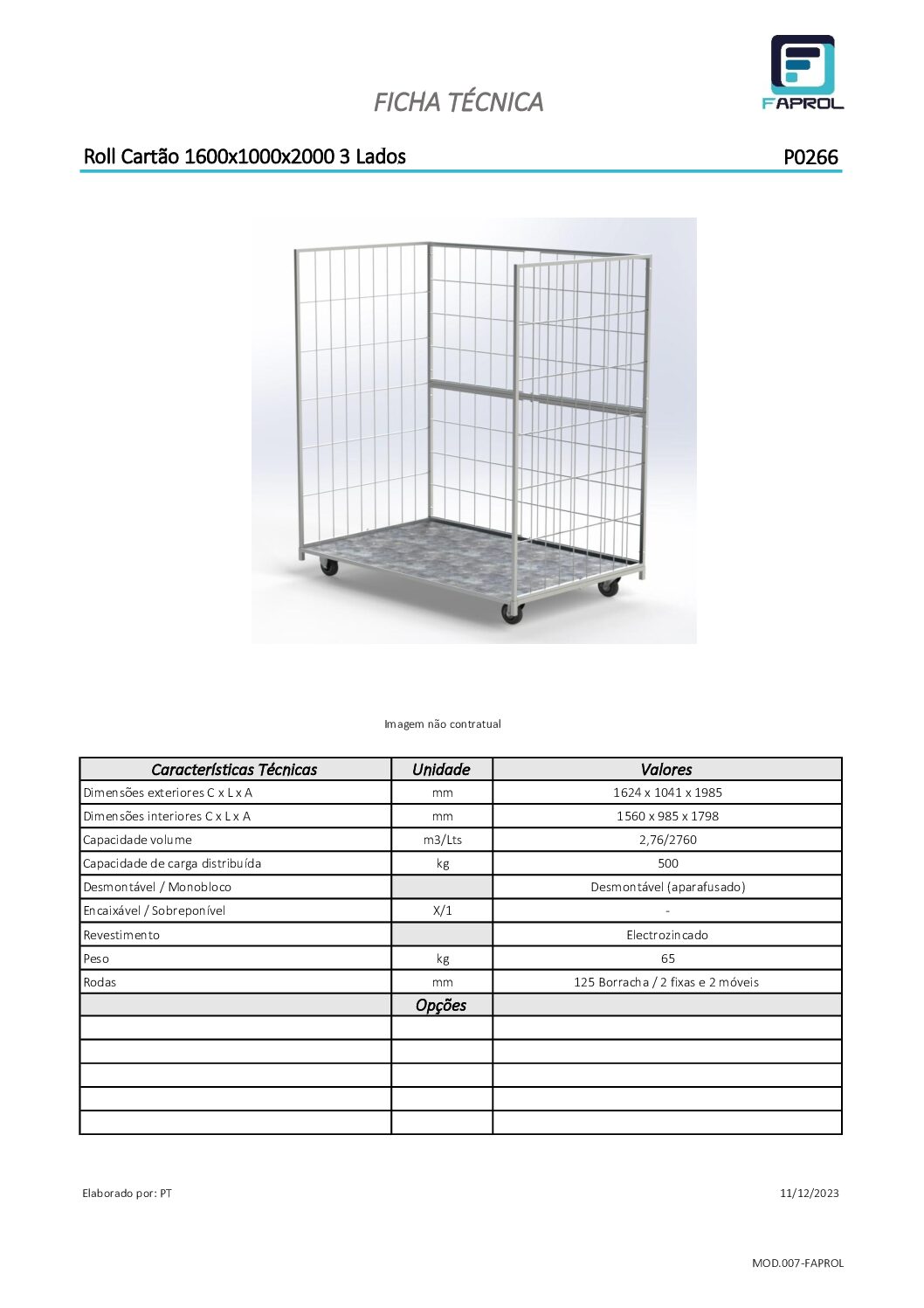 Roll Cartão 1600x1000x2000mm 3 lados é ideal para transporte seguro e organizado de produtos de grandes volumes em áreas logísticas. Roll Cartão 1600x1000x2000mm 3 lados, com chapa na base, capacidade de carga de 500kg e acabamento electrozincado. Opção de até 5 prateleiras.