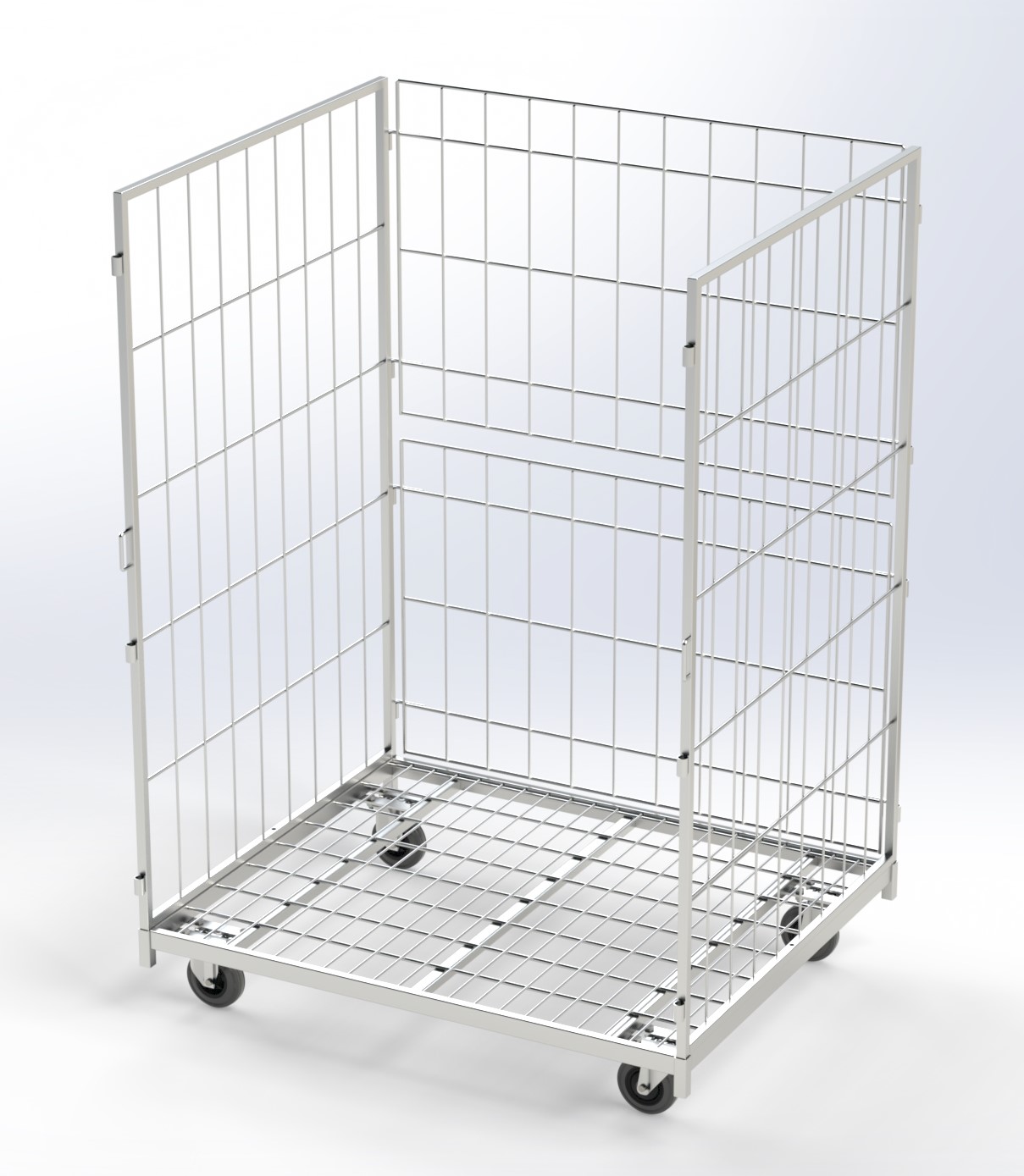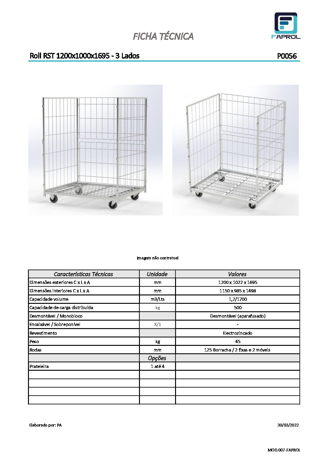 Roll Container 1200x800x1700 Roll Container constituído por 2 laterais e 2 meias portas. Meias portas desmontáveis. Este Roll Container com 1000mm de largura e 1200mm de comprimento é destinado a transportar grandes volumes. A possibilidade de ser modular, com as suas portas desmontáveis e/ou articuladas, faz com que se adapte muito rapidamente a qualquer trabalho, podendo-se transformar num Roll com 2/3/4 lados ou ainda trabalhar só com as meias portas. Pode ainda ser equipado com lança (reboque). Pedir Orçamento: