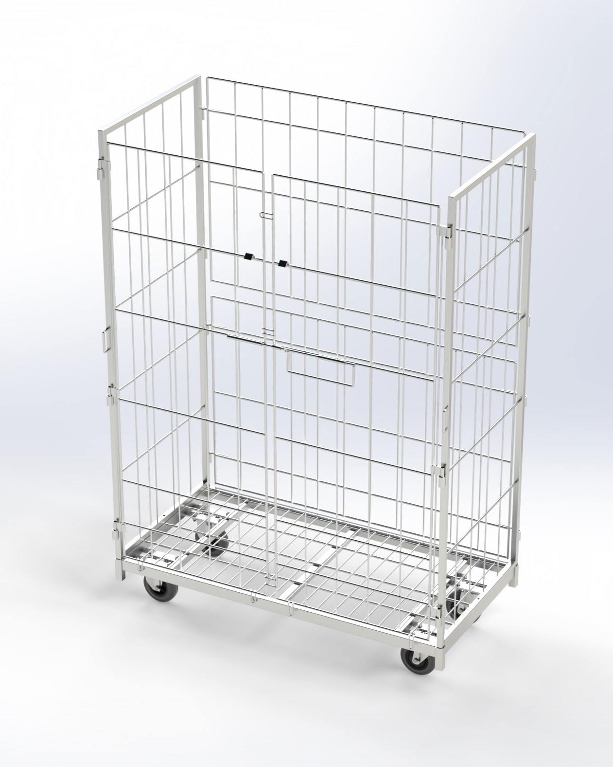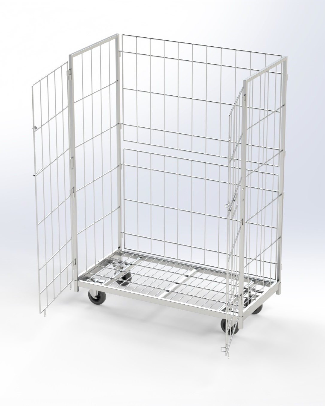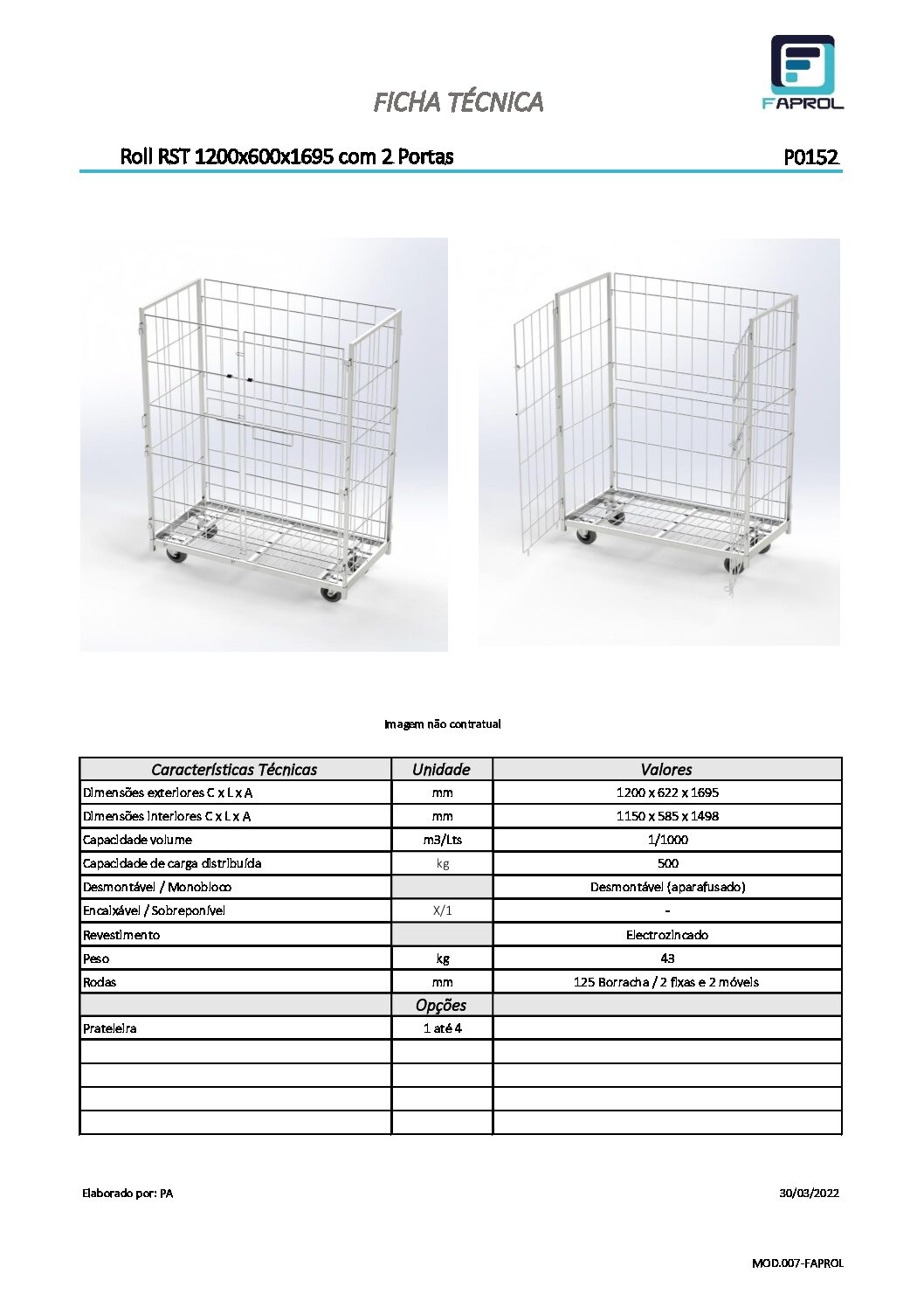 Roll Container 1200x600x1700 Roll Container constituído por 2 laterais, 2 meias portas e 2 portas verticais. Meias portas desmontáveis. Este Roll Container com 600mm de largura e 1200mm de comprimento é destinado a transportar grandes volumes, com a vantagem de passar na maioria das portas. A possibilidade de ser modular, com as suas portas desmontáveis e/ou articuladas, faz com que se adapte muito rapidamente a qualquer trabalho, podendo-se transformar num Roll com 2/3/4 lados ou ainda trabalhar só com as meias portas. Pode ainda ser equipado com lança (reboque). Pedir Orçamento: