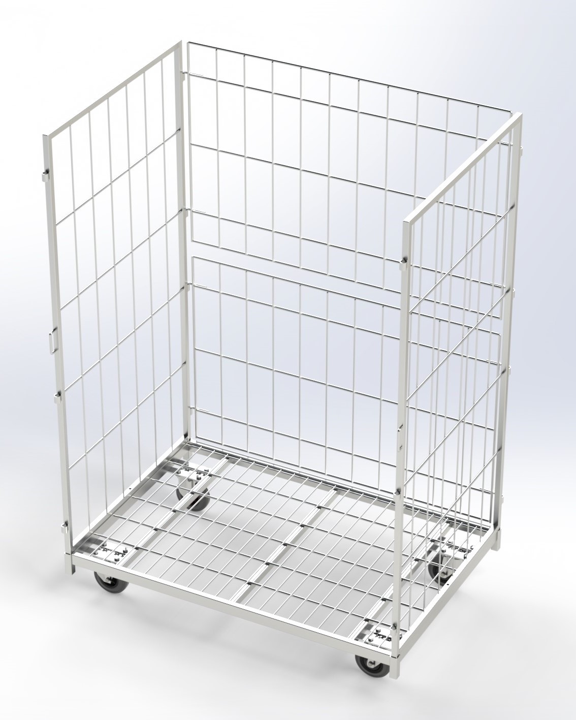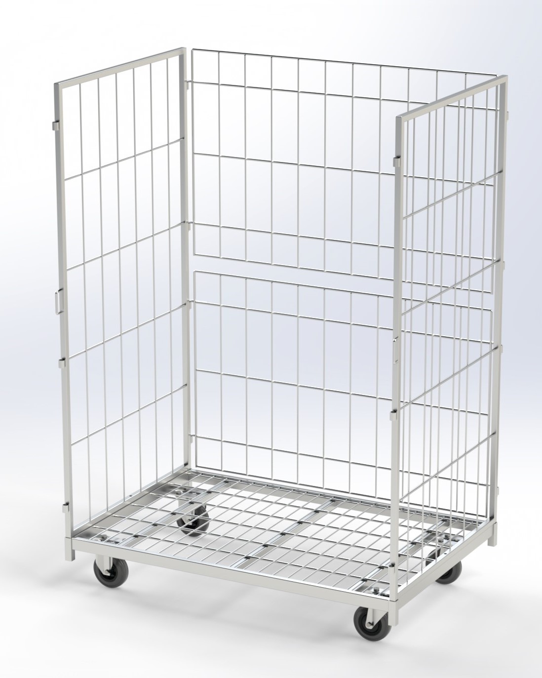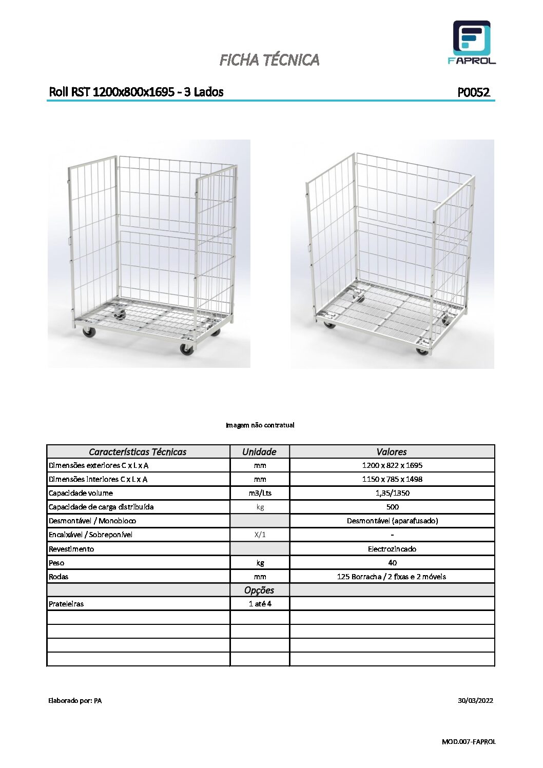 Roll Container 1200x800x1700 Roll Container constituído por 2 laterais e 2 meias portas. Meias portas desmontáveis. Este Roll Container com 800mm de largura e 1200mm de comprimento é destinado a transportar grandes volumes. A possibilidade de ser modular, com as suas portas desmontáveis e/ou articuladas, faz com que se adapte muito rapidamente a qualquer trabalho, podendo-se transformar num Roll com 2/3/4 lados ou ainda trabalhar só com as meias portas. Pode ainda ser equipado com lança (reboque). Pedir Orçamento: