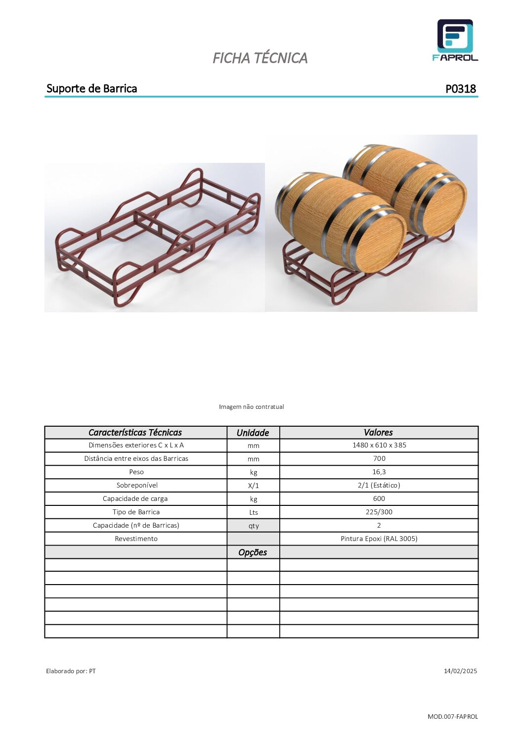 Suporte de Barrica oferece uma estrutura robusta com capacidade de até 2 barricas de 225/300 litros. Acabamento pintura.